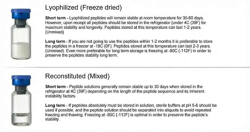 Once a peptide is reconstituted (mixed into liquid), its shelf life is significantly shorter than that of its lyophilized (powder) form. Peptides in solution are highly susceptible to bacterial degradation and instability.