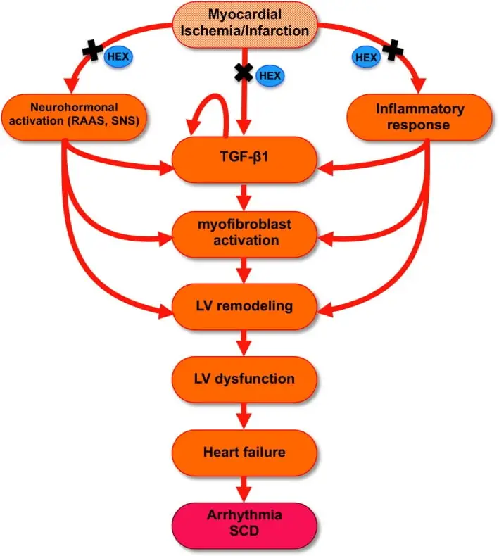 Diagram showing progression to serious long-term disease following heart attack. Blue ovals indicate how hexarelin interferes with this pathway.
