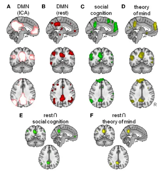 Image showing the overlap of activation between the resting mode network and parts of the brain responsible social cognition.
